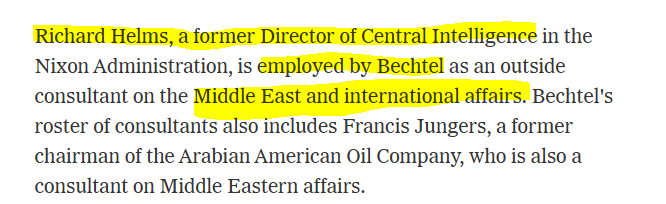 Coincidentally, Shultz, post-government, was associated with Bechtel Corporation (1974–1982 and after), which employed former CIA Director Richard Helms as a consultant and had ties to CIA-linked projects.